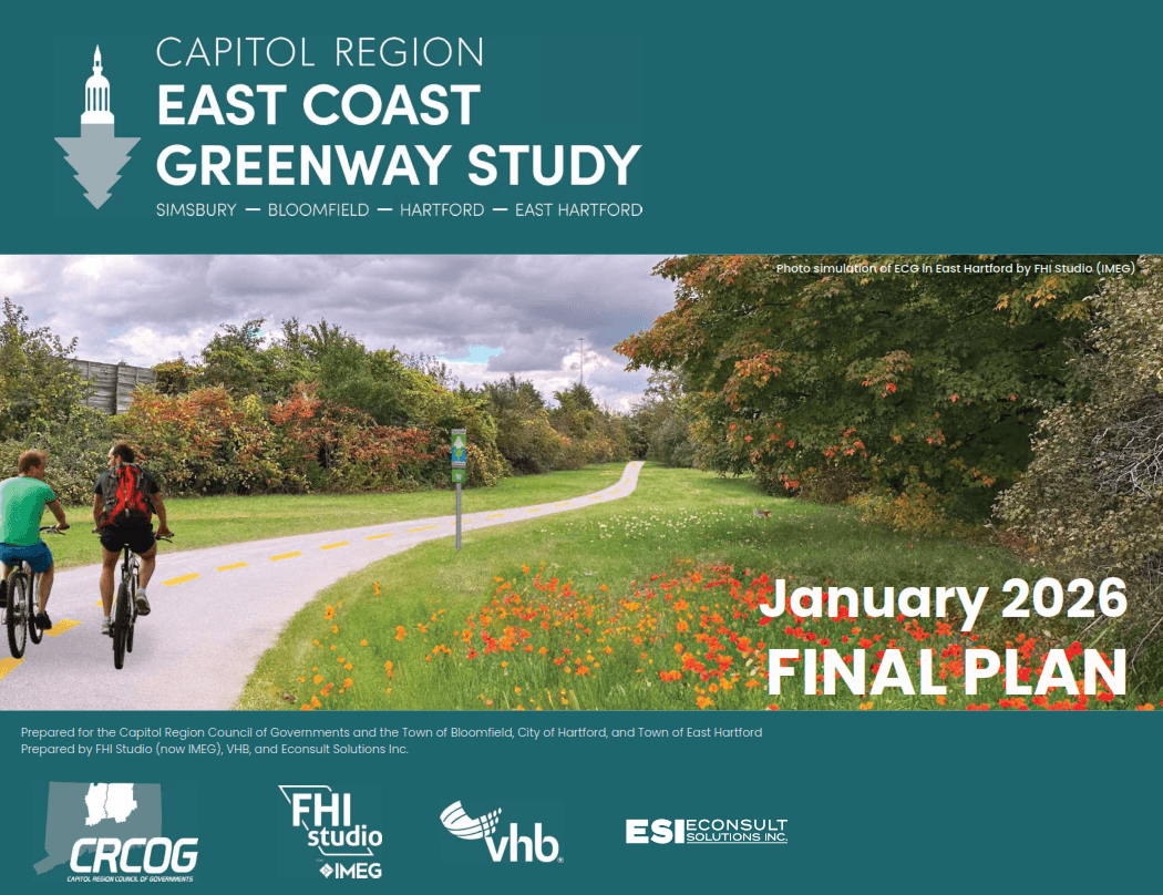 The Capitol Region Council of Governments (CRCOG) has initiated a study to identify the preferred alignment of the East Coast Greenway through the last remaining 12-mile gap in the Capitol Region in Simsbury, Bloomfield, Hartford, and East Hartford. The East Coast Greenway is an off-road walking and biking route stretching 3,000 miles from Maine to Florida. In Connecticut, the East Coast Greenway consists of a 200-mile route between the Rhode Island state line at Sterling, Connecticut and the New York state line at Greenwich. In Connecticut, the completed portions of the East Coast Greenway utilize a series of trails including the Air Line Trail, the Hop River Trail, and the Farmington Canal Trail.