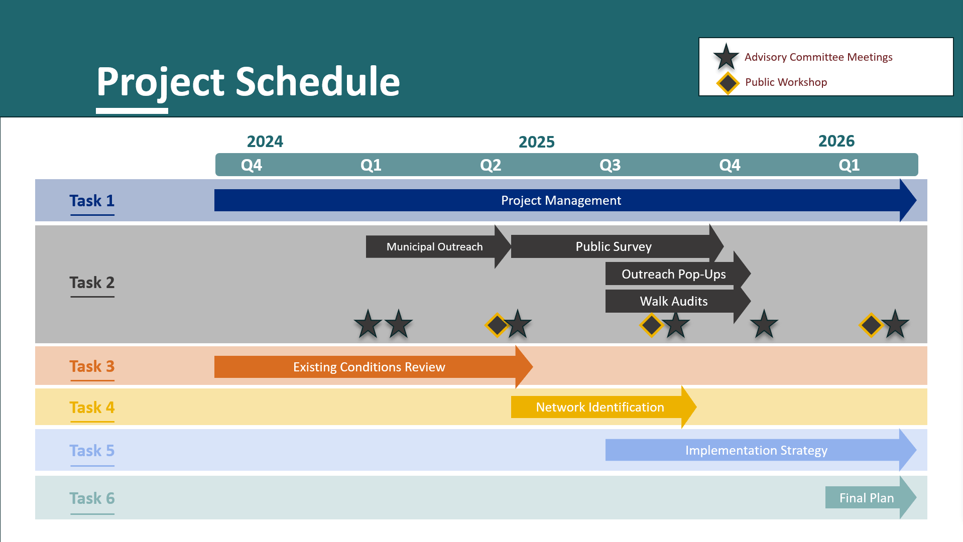 An Advisory Committee has been established for purposes of this project, consisting of city/town staff and organizations directly involved in the decision making and implementation process. From a city/town perspective, the Committee is represented by Administrators, Engineers, Planners, and School Superintendents. In addition, CTDOT, CTDEEP, and a diverse group of agencies and advocates including AARP Connecticut, Achilles International Connecticut, Bike Walk CT, Bike Walk Wethersfield, CT Health District, Eight Six Go, Transport Hartford, and local residents are represented.